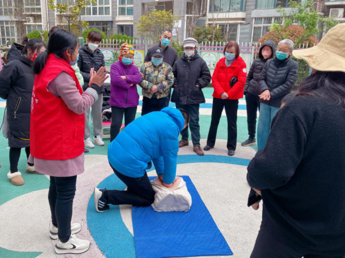 活动中,志愿者用理论和实操的方式,针对生活中可能会遇到的心脏骤停、异物卡喉类的意外事件,体验式地讲解了心肺复苏急救法、海姆立克急救法等常用的急救知识,借助模拟器具现场为居民群众和社区人员展示规范的应急救护动作和操作流程,生动形象地演示了各项细节要领,帮助大家更好的学习吸收相关知识,现场各年龄层次居民积极踊跃参与,气氛十分活跃。